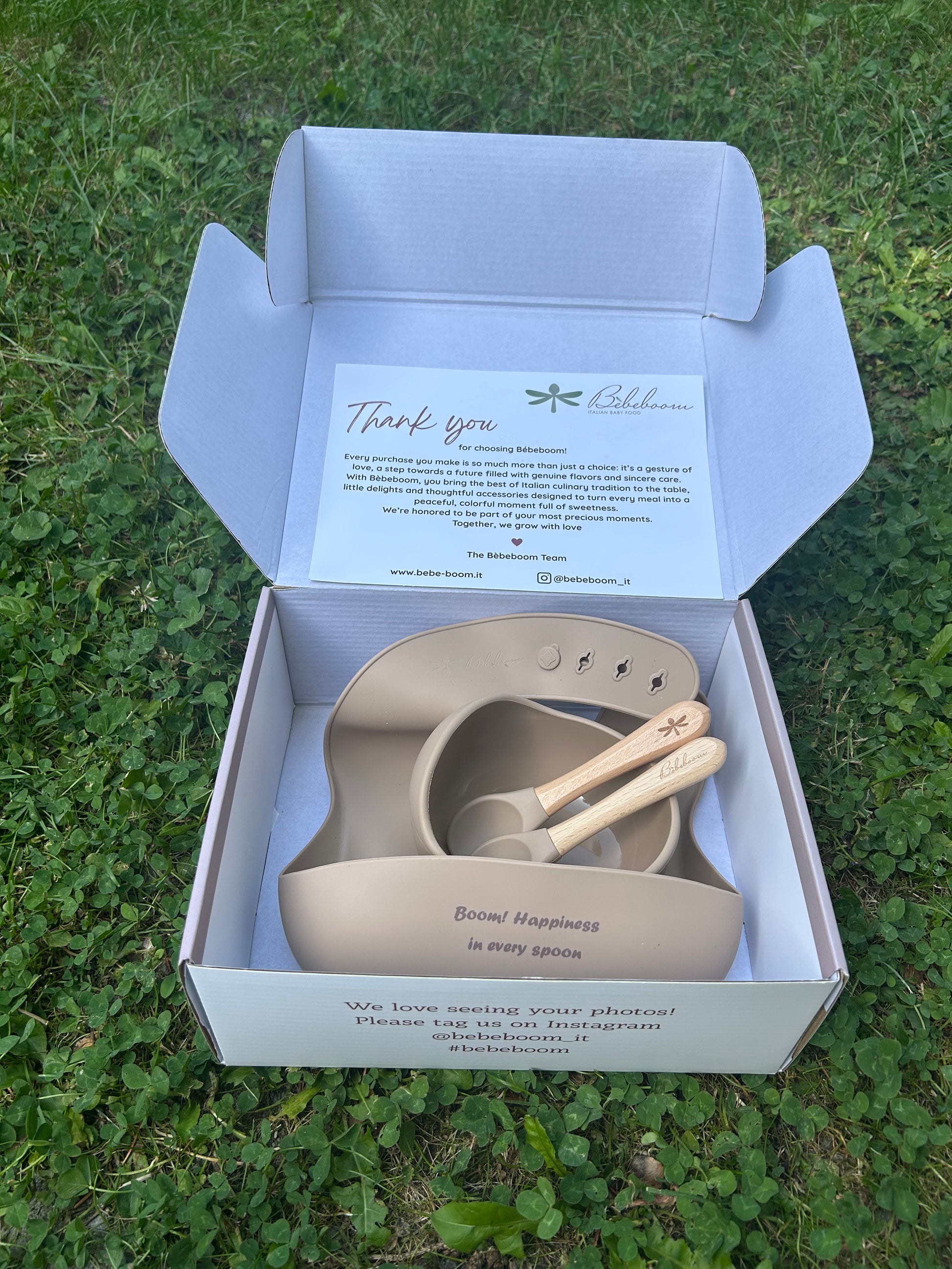 Starter Kit Bèbeboom perfetto per iniziare lo svezzamento , pensato per accompagnare i bambini nei loro primi assaggi in autonomia. Sicurezza garantita con silicone alimentare privo di BPA e materiali naturali come il bambù. Il ldesign ergonomico e curato è studiato per semplificare i pasti e stimolare lo sviluppo motorio.Per un regalo utile e originale – confezionato in una raffinata gift box Bèbeboom.